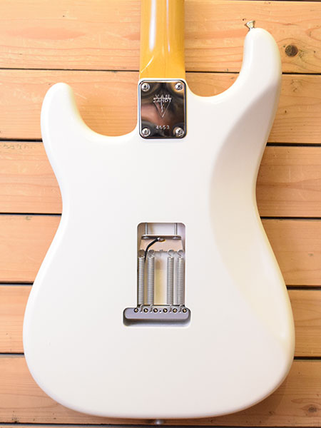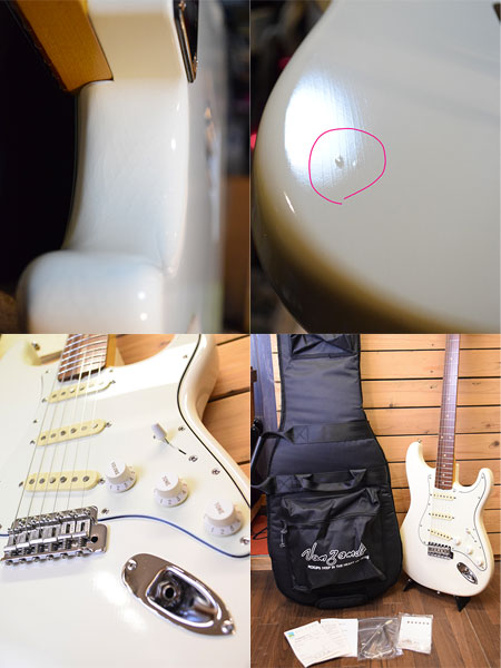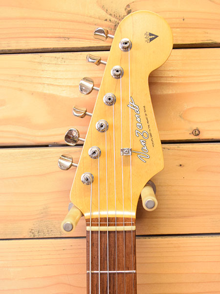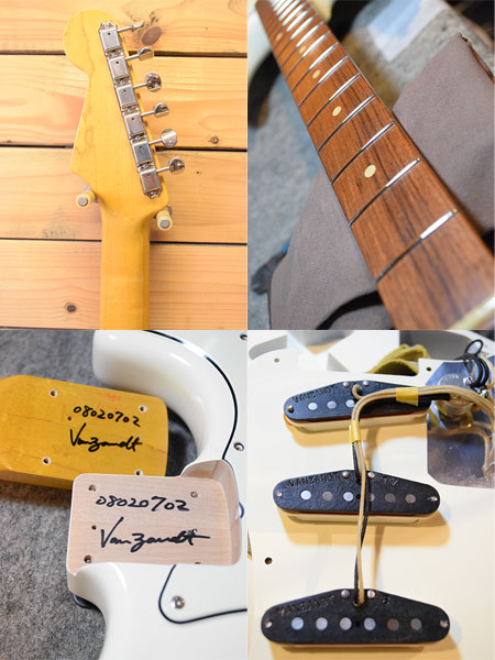 2008年製。ショップセミオーダー(名古屋/Realstandard)のアルダーボディー・ローズ(マダガスカルローズ)指板ネックのR2モデルです。基本スペックは相当のようです。ピックアップはリア・フロントにBlues、センターにTrue Vintageとなっておりパワフルでハーフトーンが大変煌びやかな印象です。使用感の殆ど無い大変綺麗な個体です。ヴァンザント特有の超激薄ラッカーフィニッシュでこのコンディションは奇跡的です(ボディーバックにポツ傷がある以外は傷の無い大変綺麗な状態です)。塗装の経年変化で全体にひけと?せが出ている事はご了承くださいませ。フレット残量は満タン近く残っており演奏性も良い個体です。10-46ゲージで調整すみでロッドにも十分な余裕もございます。状態の良い個体をお探しだった方は是非この機会に。 重量:3.4kg 付属品:オリジナルギグケース・アーム・レンチ・紙類(証明書等)・スプリングカバー(ビス×6)※裏のスプリングカバーは元々付いていない仕様です。