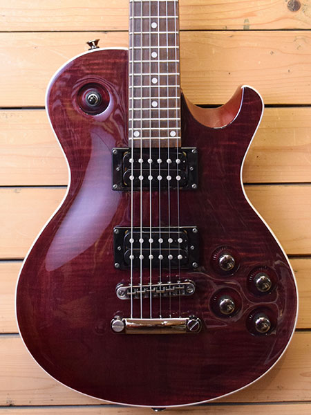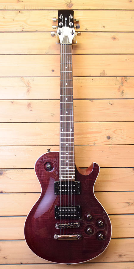 2012年製(当時定価35,000円+税)。定価設定がおかしいと思えるほどのスペックと完成度の高いモデルです。マホガニー材使用の小ぶりなディンキーLPボディーにボルトオンマホガニーネックを採用。ロングスケールとなっておりテンション感がありダウンチューニングにもお勧めできるスペックです。ピックアップにはオリジナルモデルが採用されマグネットは不明ですが13kΩとパワー感のあるマイクです。ジャンボフレット採用で演奏性にも優れた魅力的なモデルです。フレット残量は8分山と演奏性の良い個体です。ネックコンディションも良好で10-46ゲージにて調整済みでトラスロッドにも十分な余裕はございます(緩め方向は若干終点が近いようです)。金属パーツの曇りなどは若干ございますが全体的な使用感は少ない綺麗な個体です。小ぶりでデタッチャブルマホネック仕様は探すとあまり出てきません。気になった方は是非この機会に。 重量:3.2kg 付属品:オリジナルギグケース・紙類・レンチ