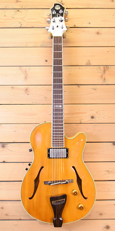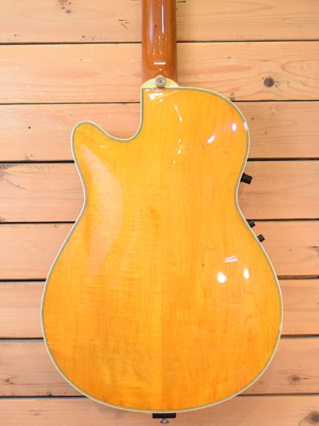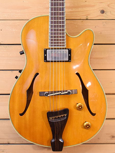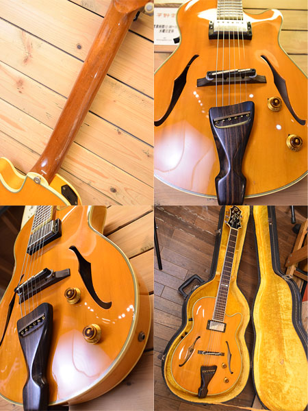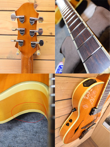 1990年代前半頃と思われるカスタムオーダーモデルです。ESPでは珍しいフルアコモデル!横幅335mmと凡そレスポール程のコンパクトなボディーサイズ。フロントにはマグネットピックアップ(ダンカン 59model)に加えブリッジにピエゾピックアップが内蔵されています。ボディーサイドのコントロールはピックアップバランサーとピエゾピックアップの2EQとなっています。ボディーはスプルース単板アーチトップにサイド・バックはメイプル材となっています。ネックはマホガニー、指板はローズウッド(マダガスカルローズ以上の良い材です)。テールピースは縞黒檀が使用されています。写真には写り辛い塗装のクラックや打痕、ボディーセルの浮きがカッタウェイ付近にございますがバッチリ調整・クリーニング済みですので演奏性の良い個体でございます。フレット残量は7〜8分山程。ダダリオEGC23(10-48)フラットワウンドゲージにて調整済みでトラスロッドにも余裕はございます。NCなど使えないので殆どが手作業で造られたと思われます。大変貴重な個体ですので気になった方はお早めに。 重量:2.4kg 付属品:汎用ハードケース(サイズ大き目・取っ手破損 オマケ程度にお考えください)