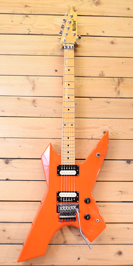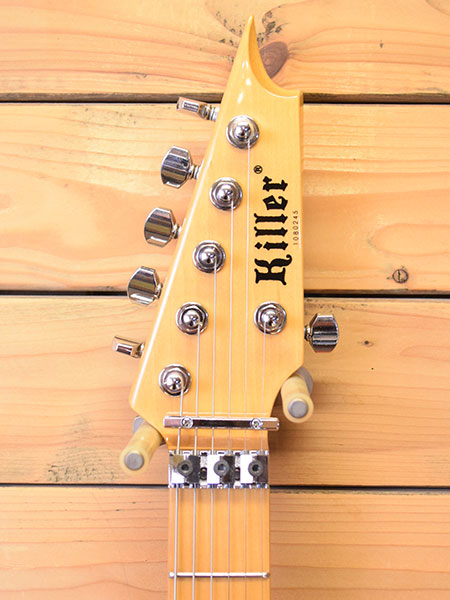 キラーを代表する人気モデルのミドルグレード(日本製)です。アッシュボディーにオリジナルフロイドローズ採用。ピックアップにはSeymour Duncan SH-2N(JAZZ)/TB-11(Custom Custom)が搭載されパワフルで輪郭のあるリアサウンドと音粒の分離が良いフロントサウンドが楽しめます。加えてVシェイプネックとナロートールフレットの組み合わせはこのモデルならではの弾き心地です。 比較的綺麗な個体です。ボディー角の塗装チップは無く金属パーツも綺麗な状態です。ネック裏に数か所小傷がございます。ウラパネにカケ、ボディーバックに薄くすり傷はございますが全体の艶感もあり実質的な使用感は少ないようです。09-42ゲージにてネック調整済みでトラスロッドにも十分な余裕がございます。フレット残量も8分山以上とタップリ残っており演奏性もバッチリです。造りも良くパーツも良いモデルです。気になった方は是非この機会に。 重量:3.5kg 付属品:オリジナルソフトケース ■通信販売の際は別途送料一律\1,500(離島は除く)