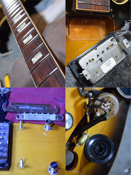1976年製。メイプルネック期のコイルタップスイッチ付きES-335を大胆かつ実用的にモディファイされた個体です。ペグはGROVERに交換されフレットはナロートールサイズにリフレット(リナット/牛骨)、ブランコテイルピースからストップテイルピースに交換されブリッジはスタッドアンカーからメイプル埋めGibson ABRに交換、ピックアップは近年のGibson 57Classicに前後とも交換されています(コイルタップスイッチはダミーになっています)。メイプルネックらしいハイミッドレンジが豊かなサウンドです。 ボディートップ・バックにウェザーチェックが出ており雰囲気も良い個体です。POTは1976年のオリジナルでございます。リフレットはおそらく近年に施されており、施工後の使用感は軽度で8分山以上とタップリ残っており演奏性も大変良い印象です。10-46ゲージにてネック調整済みでトラスロッドにも十分な余裕な余裕がございます。オリジナル度は低いですが実用的で魅力的な個体です。大変お買得な一本ですので気になった方は是非この機会に。 重量:3.9kg 付属品:オリジナルハードケース(ステッカー有り・取っ手交換有り) ■通信販売の際は別途送料一律\1,500(離島は除く)