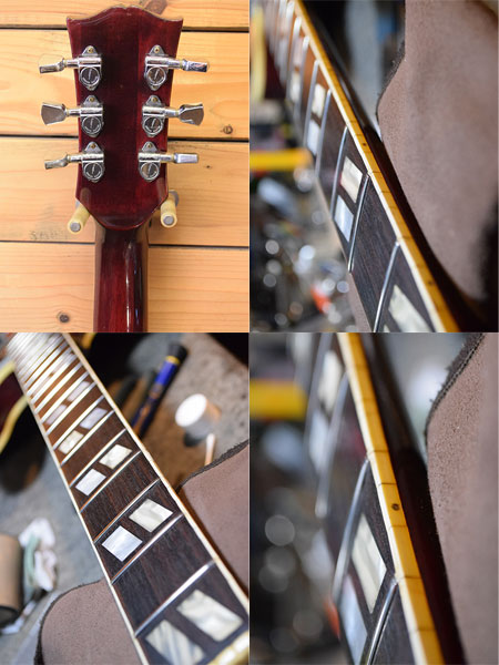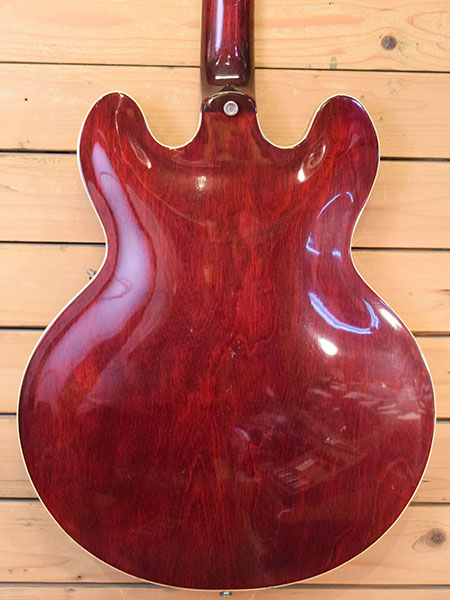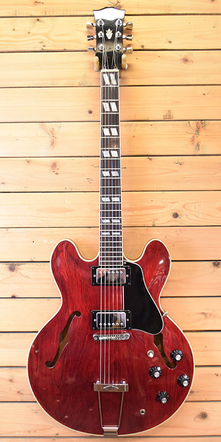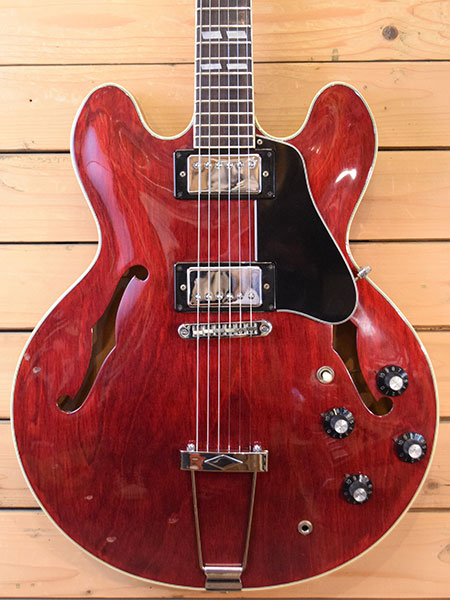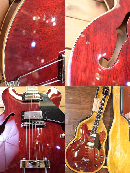 仕様とピックアップデイトより1975年製と判断致しました。カーリーメイプルボディーにメイプル+ストライプエボニー指板の70年代ES-335仕様となっております。煌びやかでエアー感のあるサウンドが魅力です。経年変化も手伝って枯れた生鳴りも心地よい個体です。 ネックサイドのバインディングが経年で痩せてヒビが出ていますがカケ部分はまだございません。ボディートップに数か所打痕がございますがそれ以外は目立った傷も無く年式の割に綺麗な個体です。09-42ゲージにてネック調整済みでトラスロッドにも余裕がございます。フレット残量は7分山程で演奏性も良い印象です。雰囲気の良い個体です。気になった方は是非この機会に。 重量:3.9kg 付属品:当時のハードケース(イーグルスとベンチャーズのシール貼ってます)・グレコ工具セット(6角レンチ・ドライバー) ■通信販売の際は別途送料一律\1,500(離島は除く)